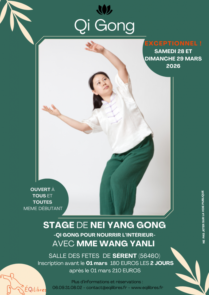 Évènements PROCHAINEMENT STAGE DE QI GONG avec Mme Wang Yanlile samedi 28 et le dimanche 29 mars 2026 Pour télécharger la fiche d’inscription Cliquez ici
